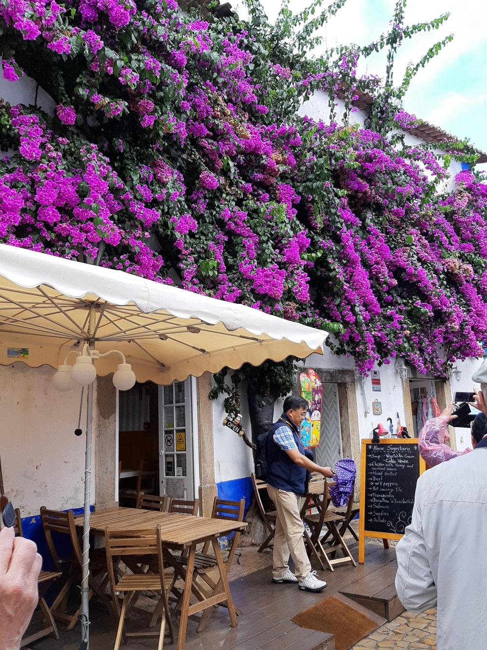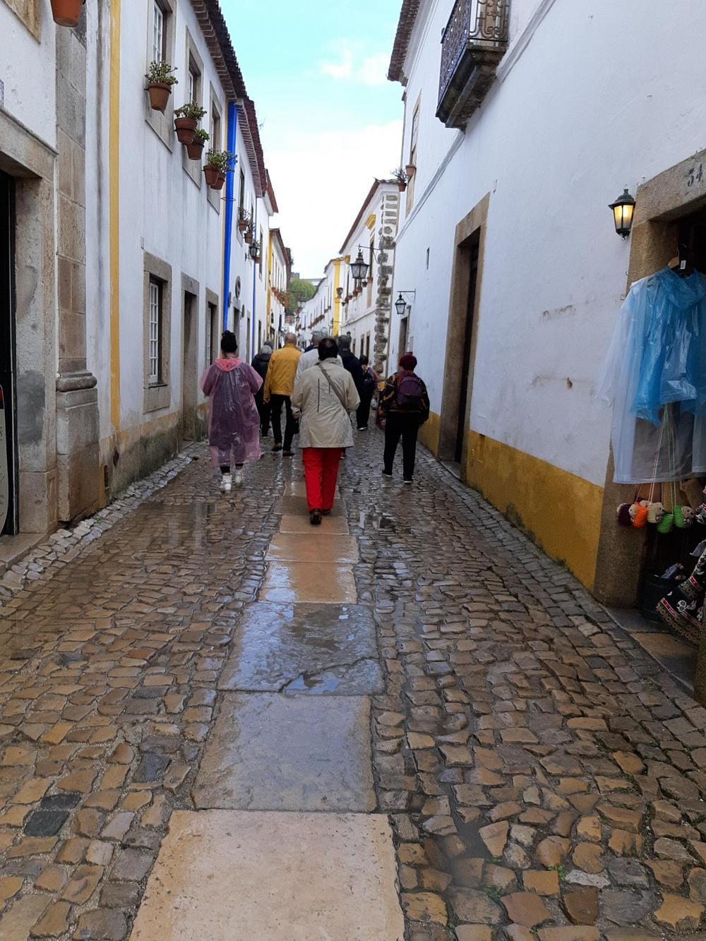 Obidos - kukkaloistoa ja liukas pääkatu tihkusteessa. Kuvat: Leena Railio