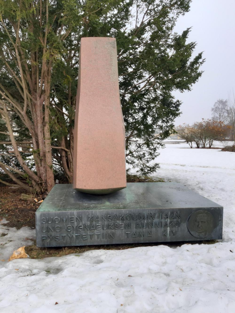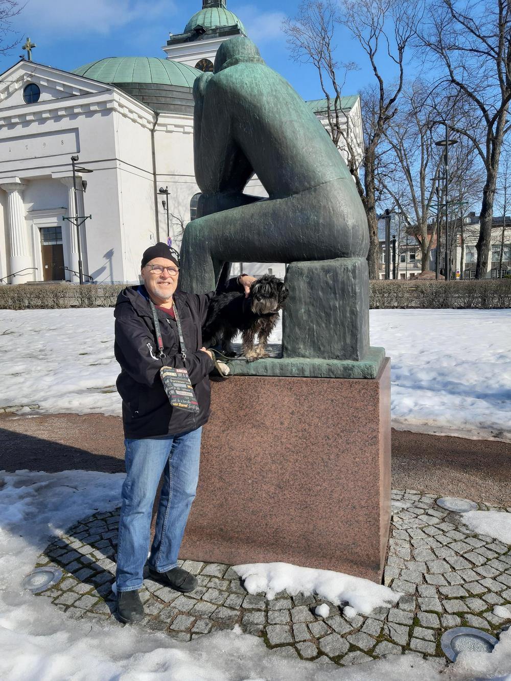 Tehtävänkin kohteena ollutta Larin-Kyöstin patsasta (Mikko Hovi 1962) kuvasi useampikin patsaita kiertänyt. Leena onnistui kuvaamaan patsasbongarit Jorman ja Iivo-kääpiösnautserin. Aamulenkillä Leena kuvasi Uno Cygnaeuksen muistokiven Kaurialassa. Kuvat: Leena Railio