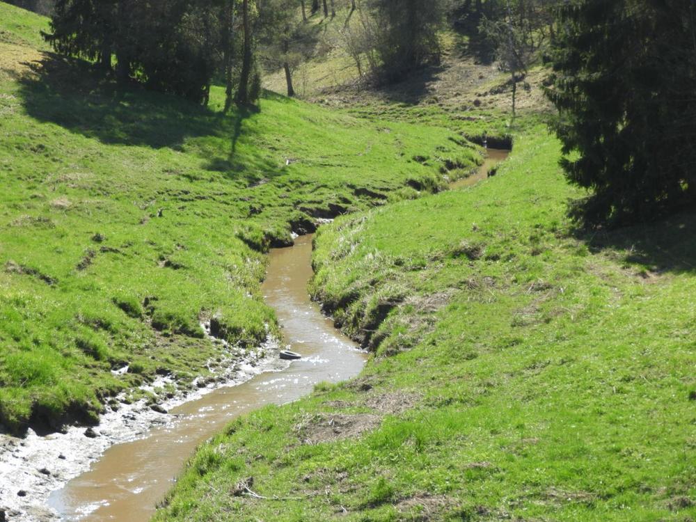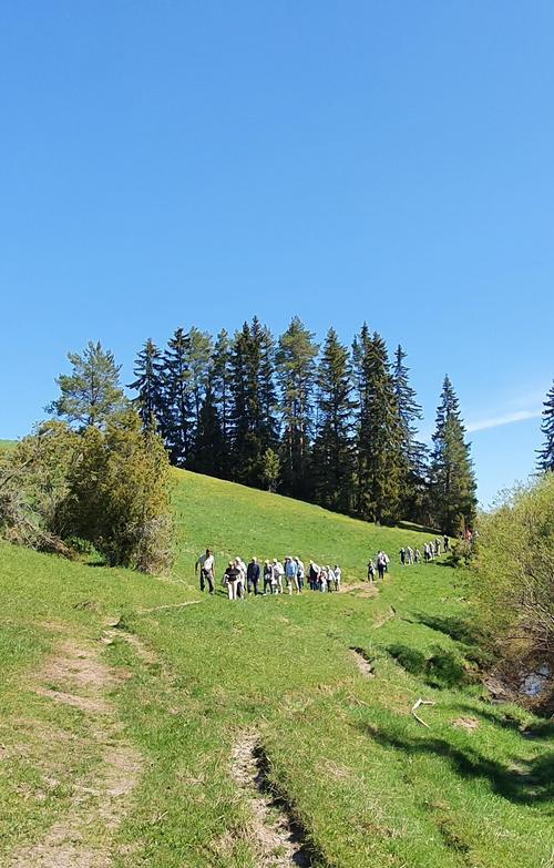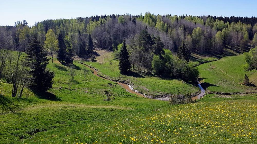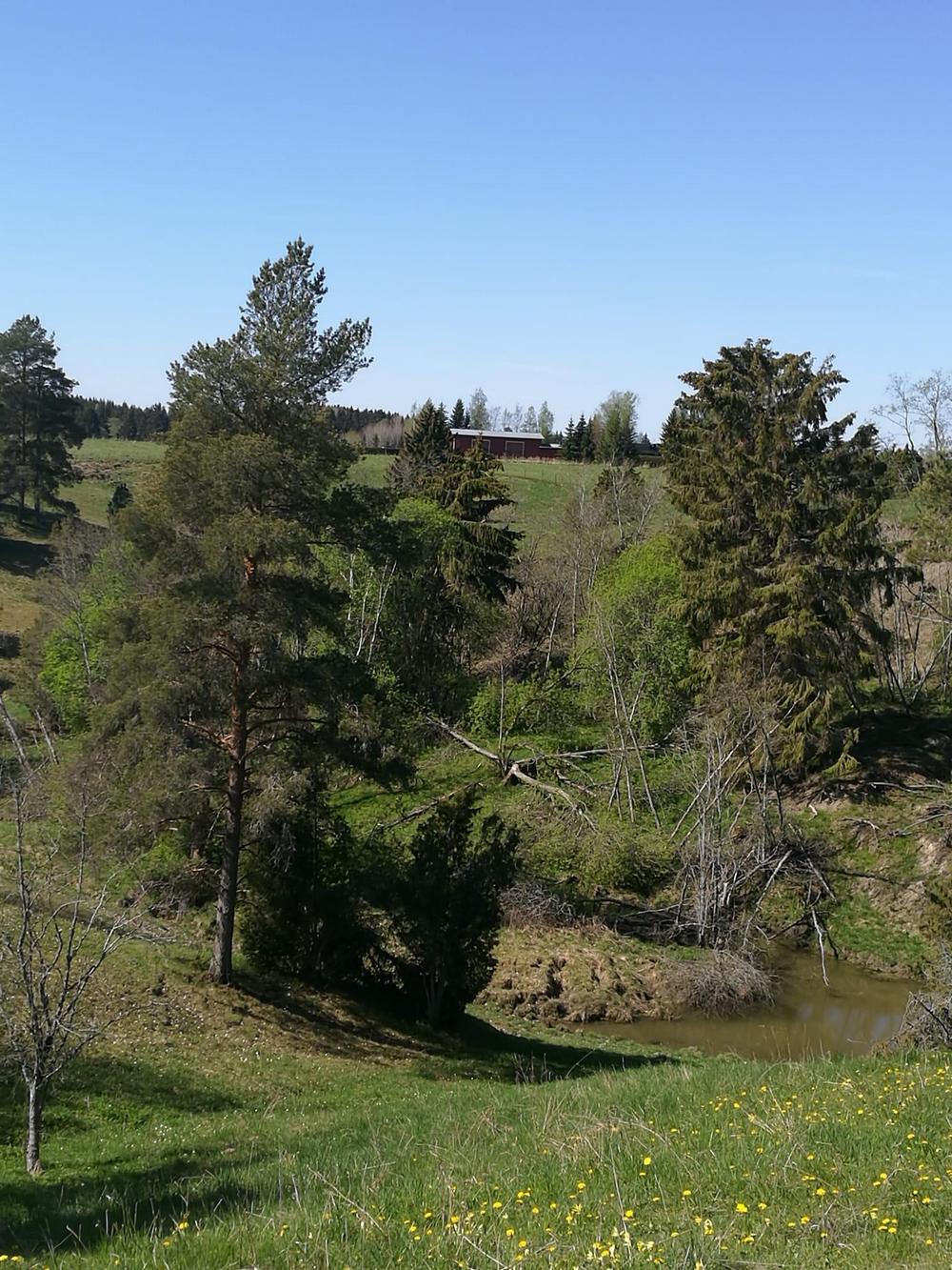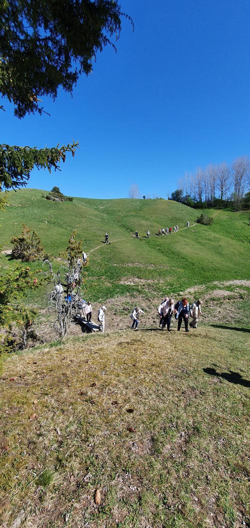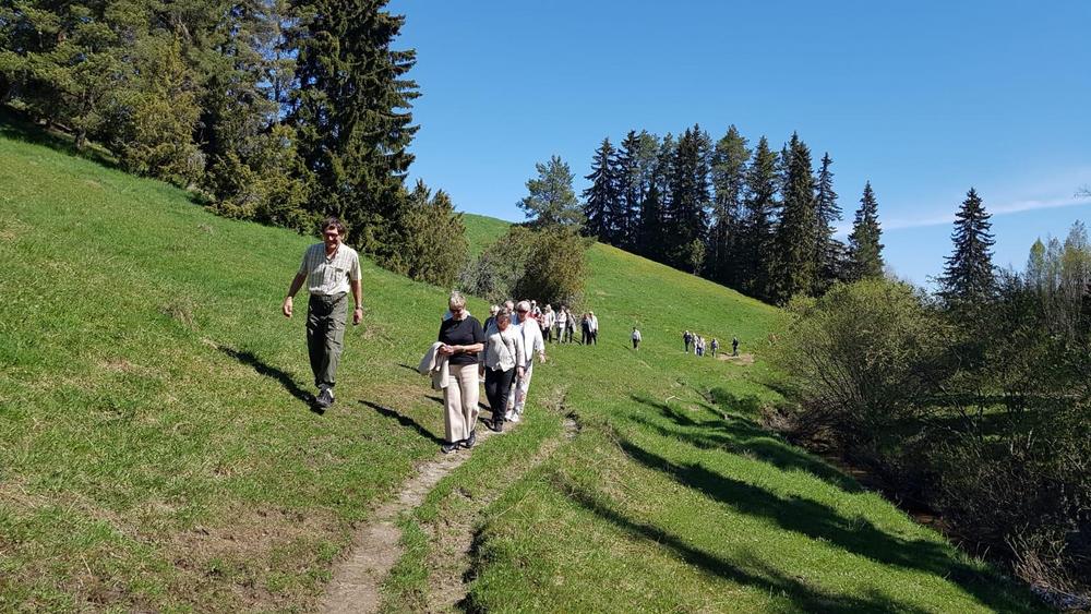 Matti johdattaa ryhmää notkon pohjalle - ja retken lopuksi tutustumme kirkkoon. Kuvat: Leila Ahonen