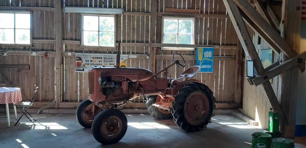 Hovilan pihapiirissä, näyttelyn traktori sekä Arjan opastusta Baddingin ja Kaija Aarikan haudoilla. Kuvat: Jorma Railio