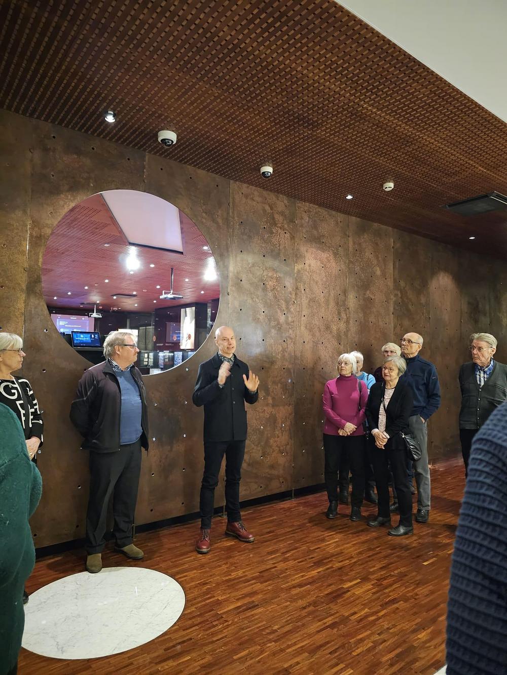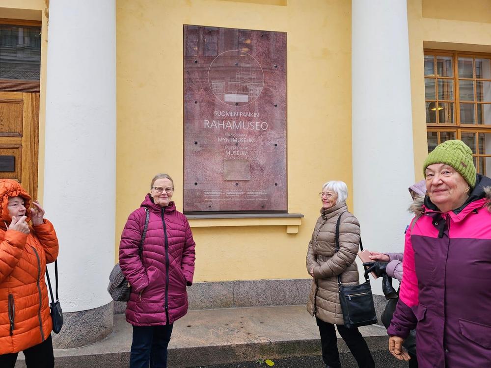 Ryhmäämme Rahamuseon aulassa, salissa ja edustalla kuvasi Anna Kaarina Aaltonen-Wagoner.