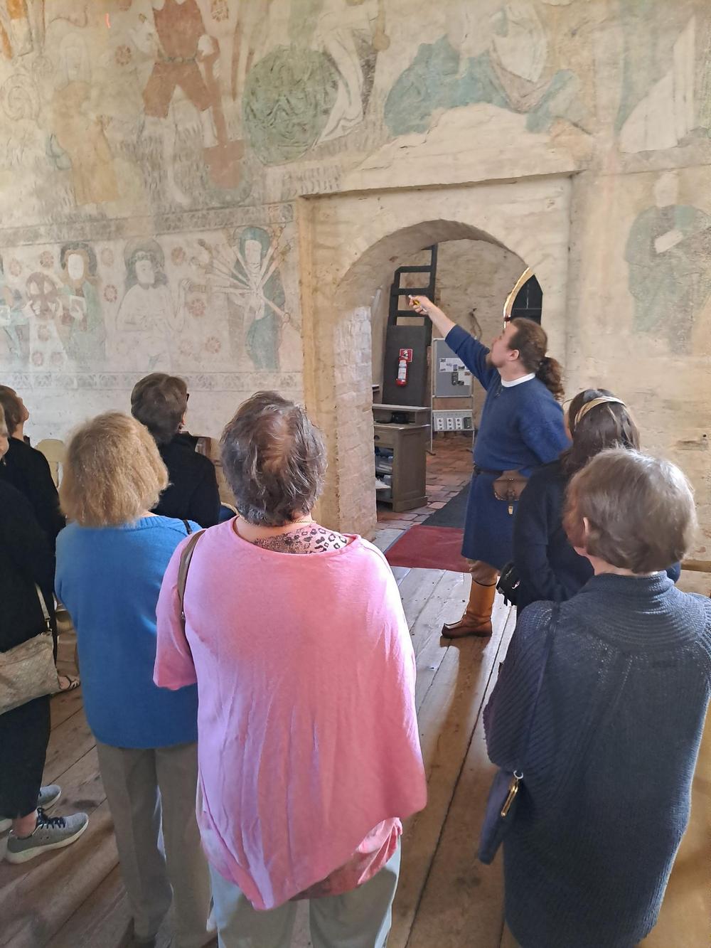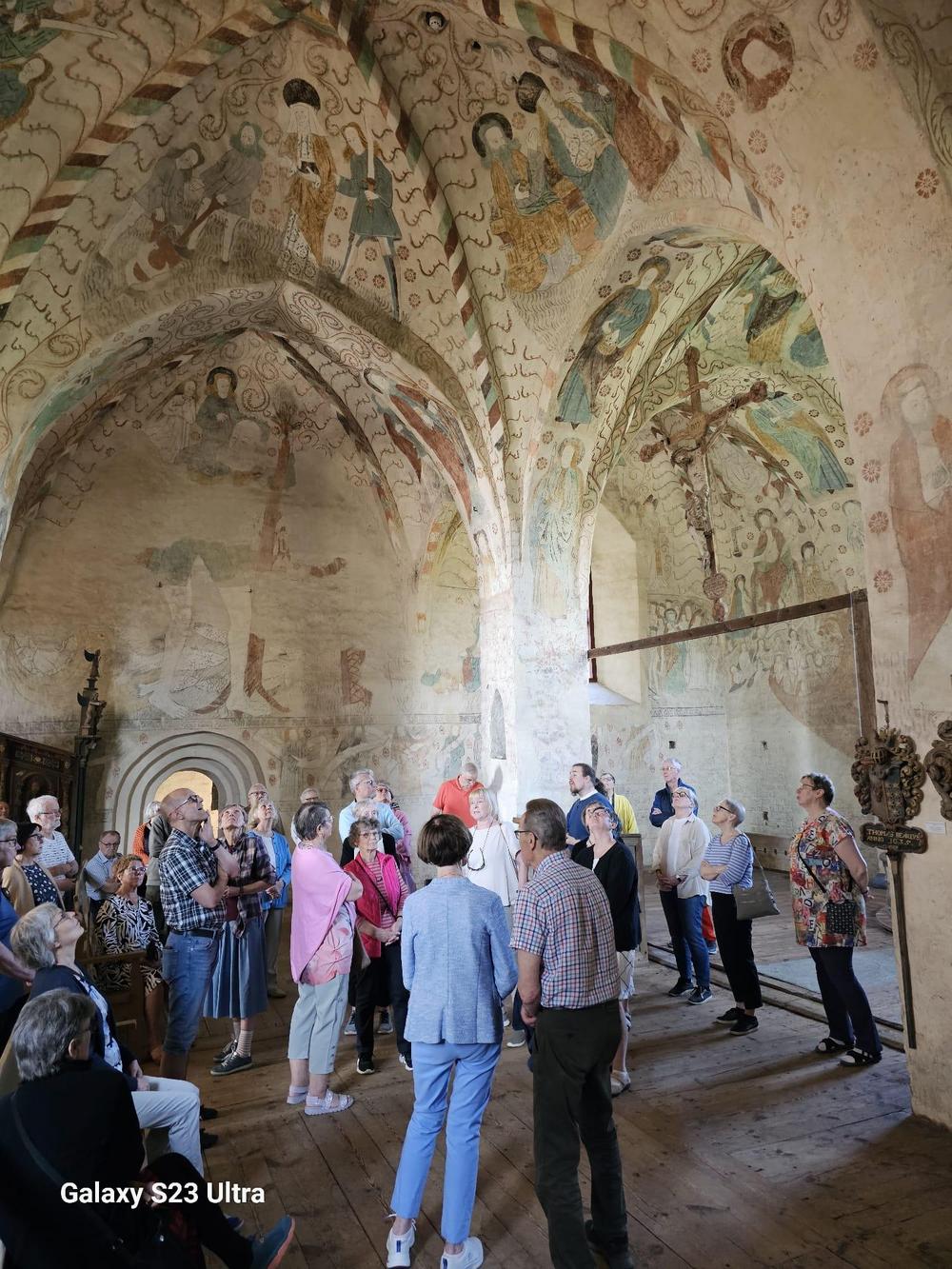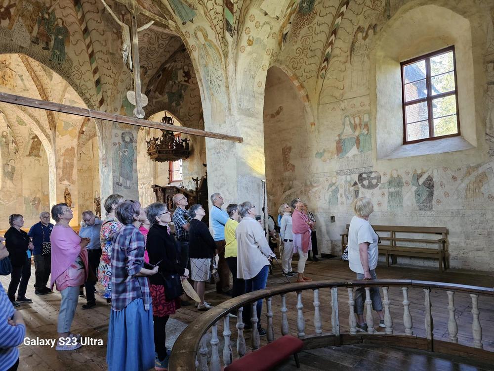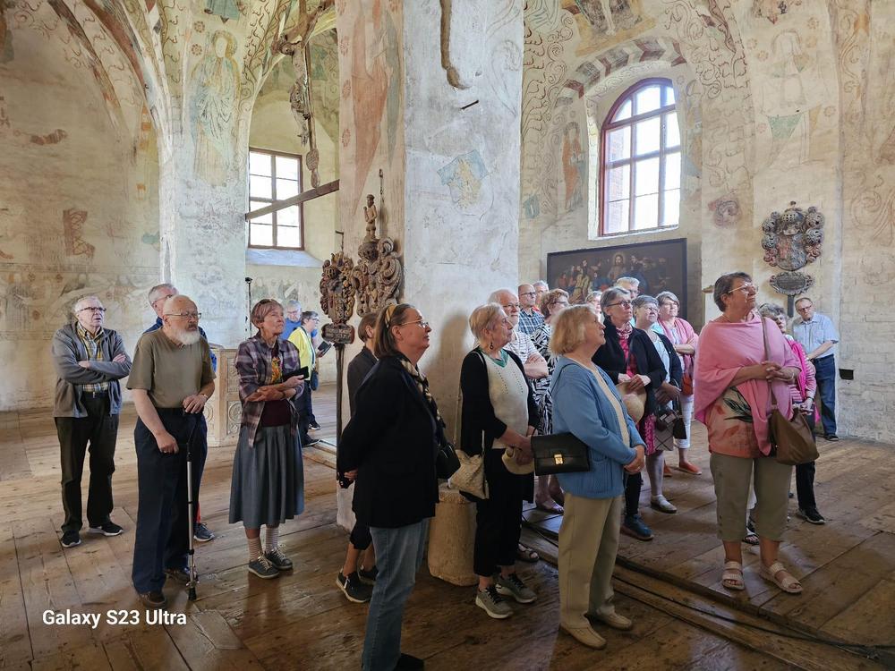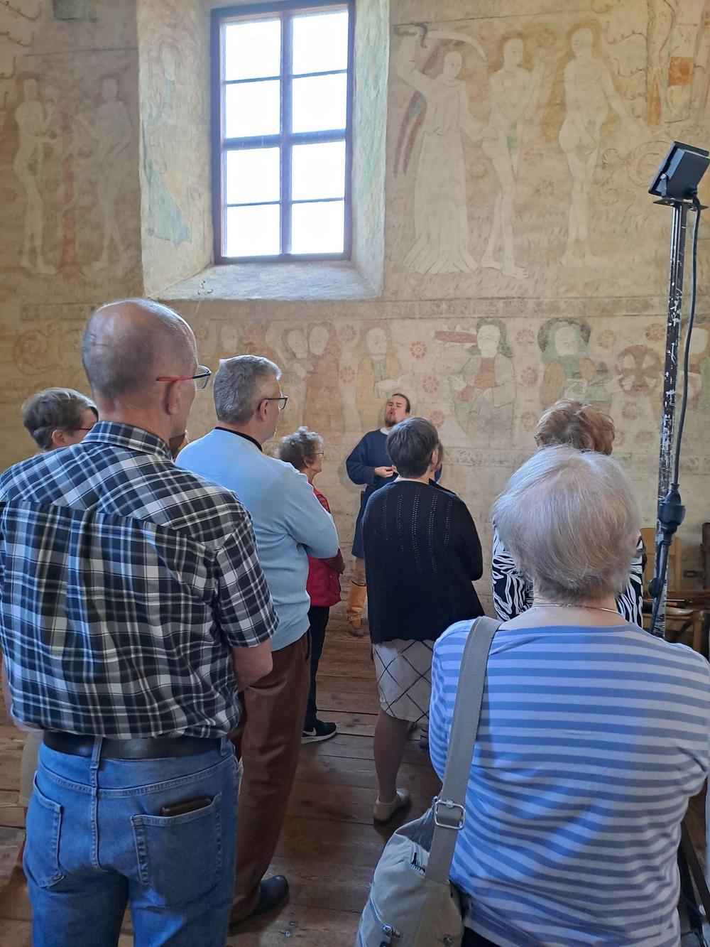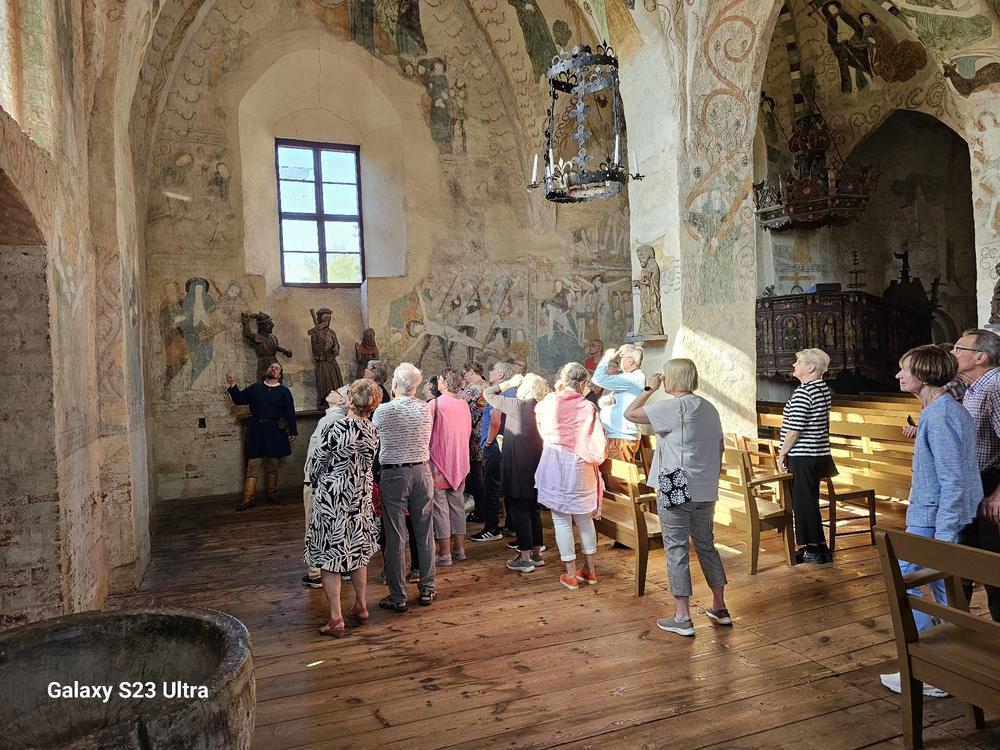 38 senioria tutustui lämpimässä, lähes helteisessä kevätillassa mukavan viileään keskiaikaiseen Pyhän Ristin kirkkoon ja "Rottien pyhimys"- kirjasta ja näytelmästä tutuiksi tulleisiin seinämaalauksiin. Oppaamme Vilppu Vuori kertoi yli 500 vuotta vanhojen maalausten aiheista innostuneesti ja värikkäästi. Selostusten jälkeen Vilppu yllätti musiikkilahjoillaan soittaen kolmea harvinaista perinneinstrumenttia.