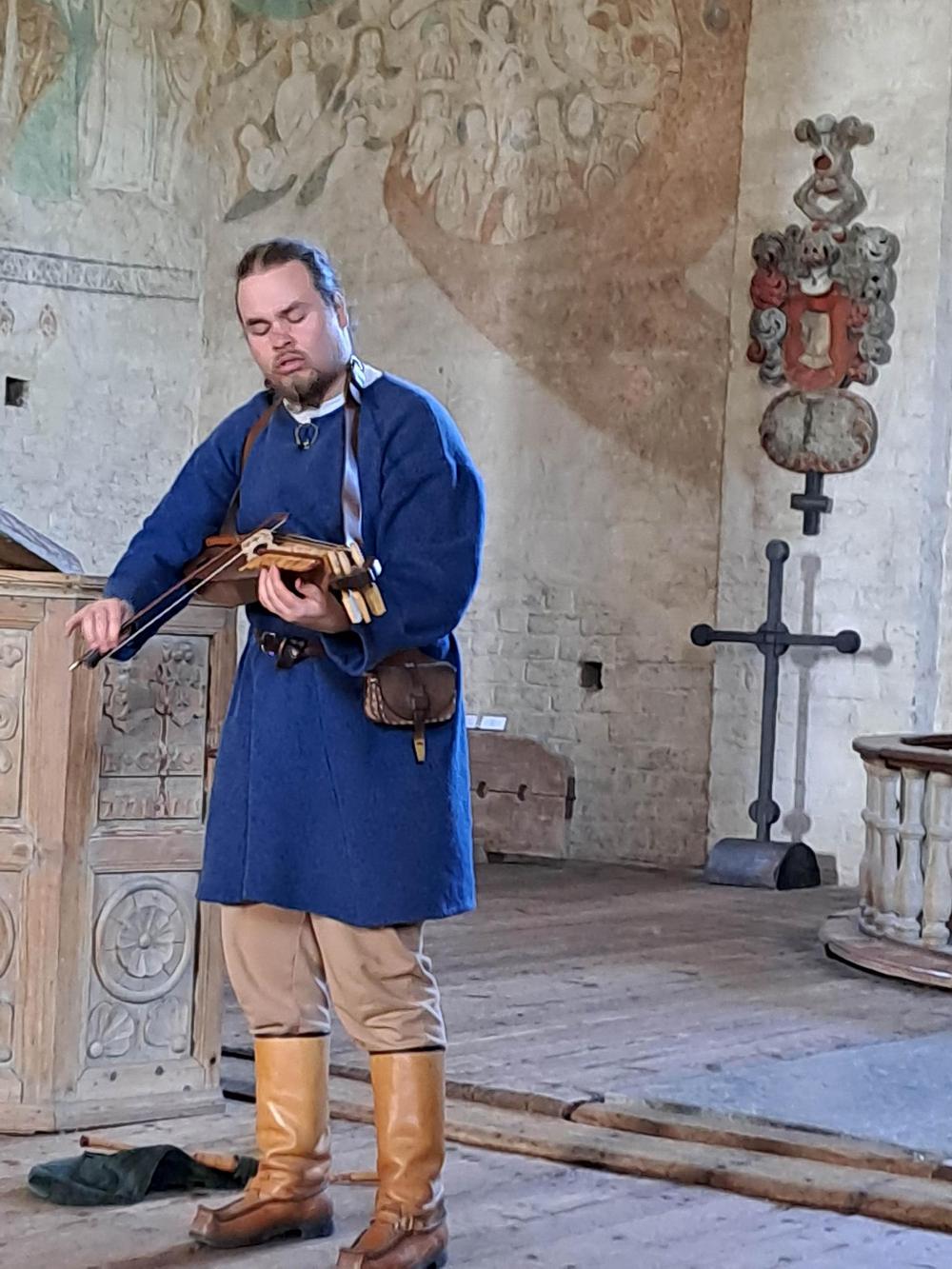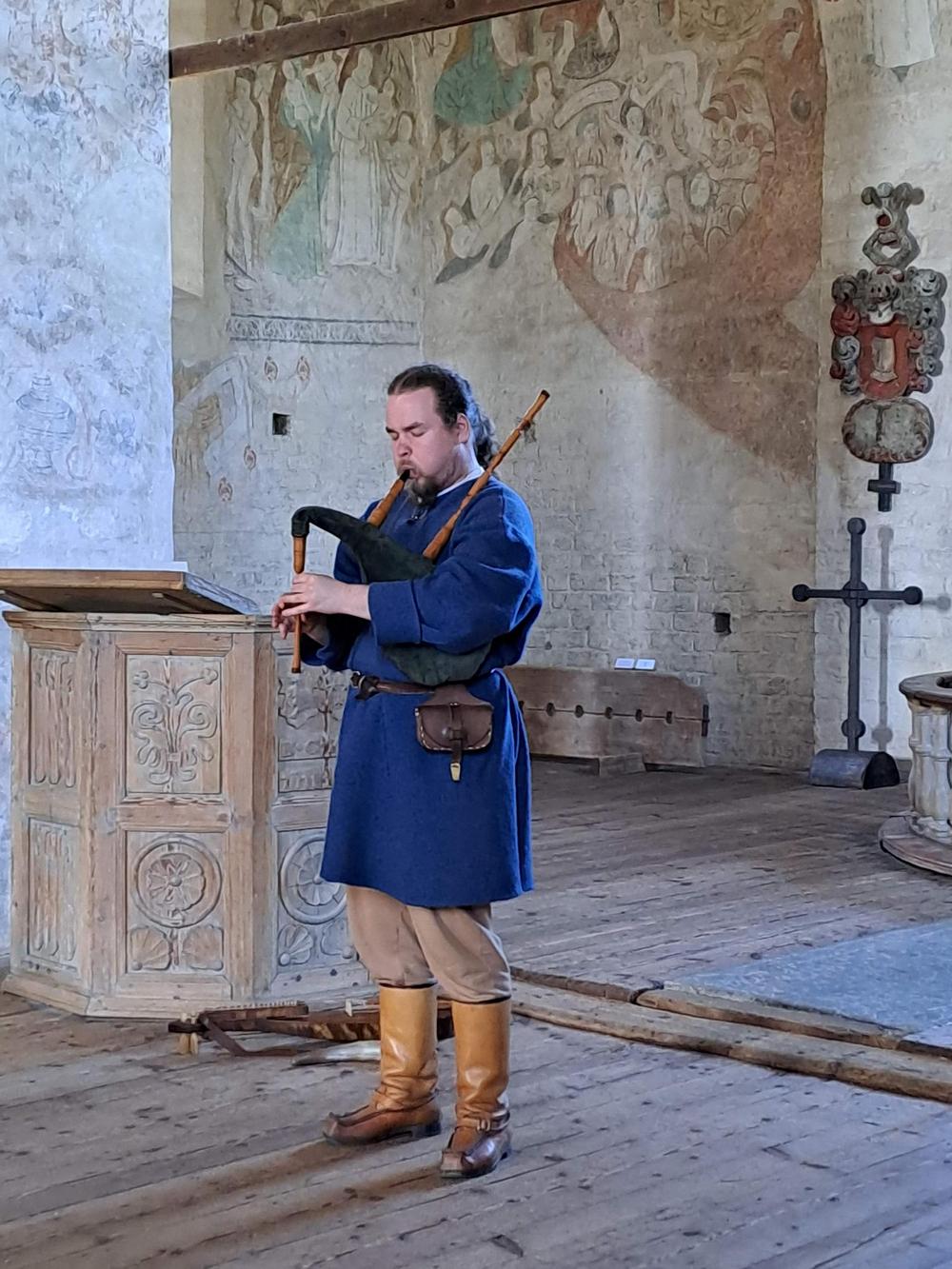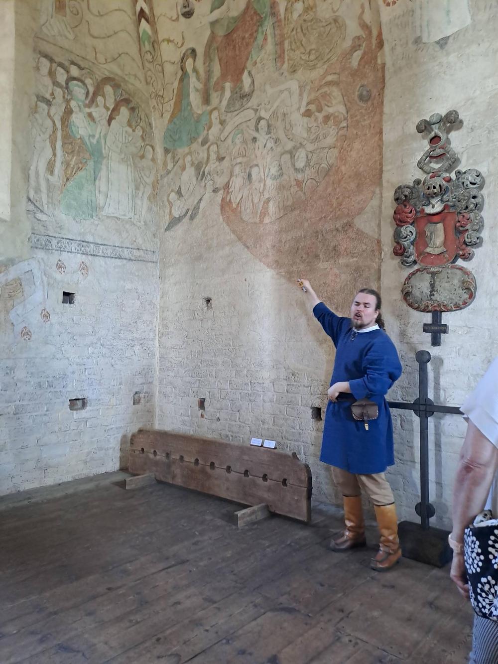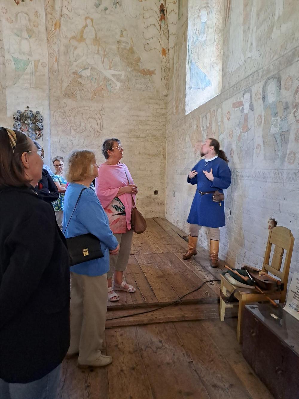 38 senioria tutustui lämpimässä, lähes helteisessä kevätillassa mukavan viileään keskiaikaiseen Pyhän Ristin kirkkoon ja "Rottien pyhimys"- kirjasta ja näytelmästä tutuiksi tulleisiin seinämaalauksiin. Oppaamme Vilppu Vuori kertoi yli 500 vuotta vanhojen maalausten aiheista innostuneesti ja värikkäästi. Selostusten jälkeen Vilppu yllätti musiikkilahjoillaan soittaen kolmea harvinaista perinneinstrumenttia.