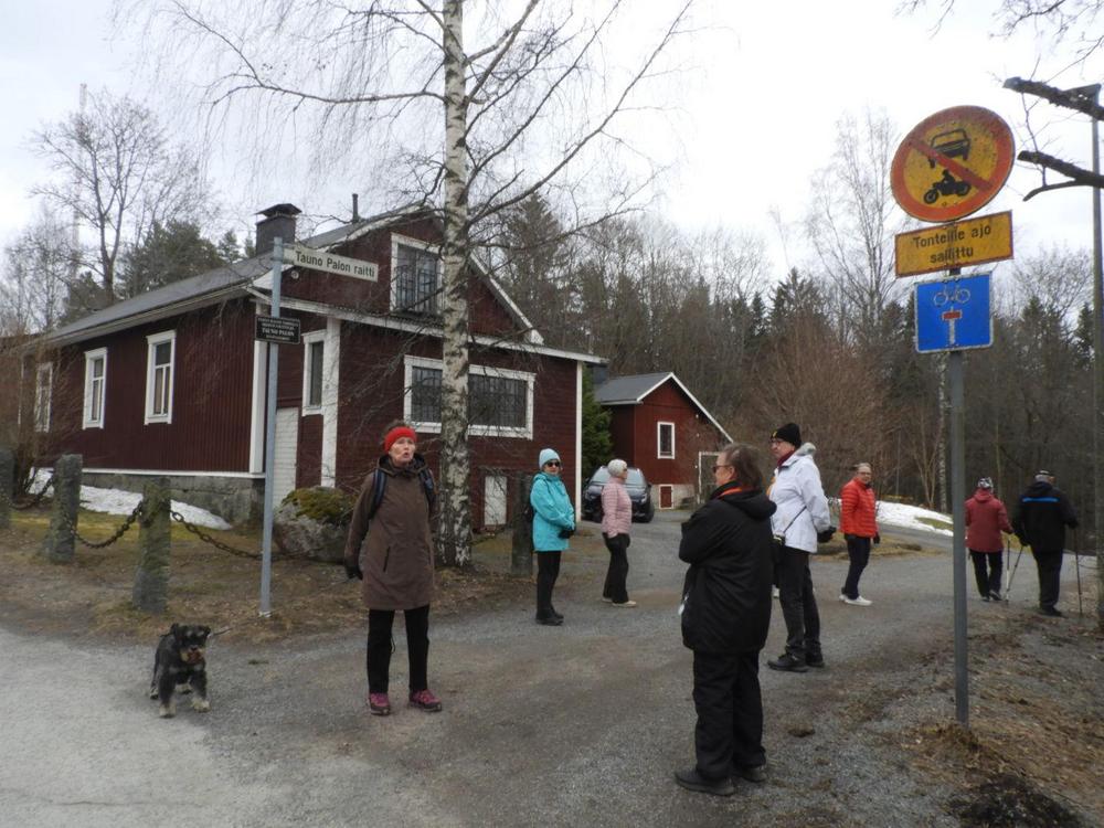 !5 senioria ja kaksi kääpiösnautseria tutustuivat Myllymäen maisemiin keväisellä kävelyretkellä mukavassa pilvipoutasäässä. Tutuiksi tuli niin Wanha Kanttiini, Kuninkaanlähde, mäelle nimensä antaneen jo 1800-luvun lopulla puretun tuulimyllyn paikka kuin Tauno Palon raitti. Kuvat: Markku Hietala