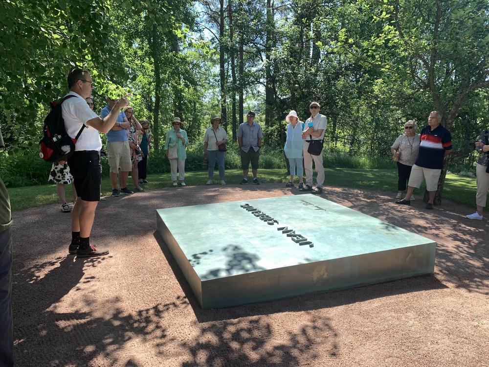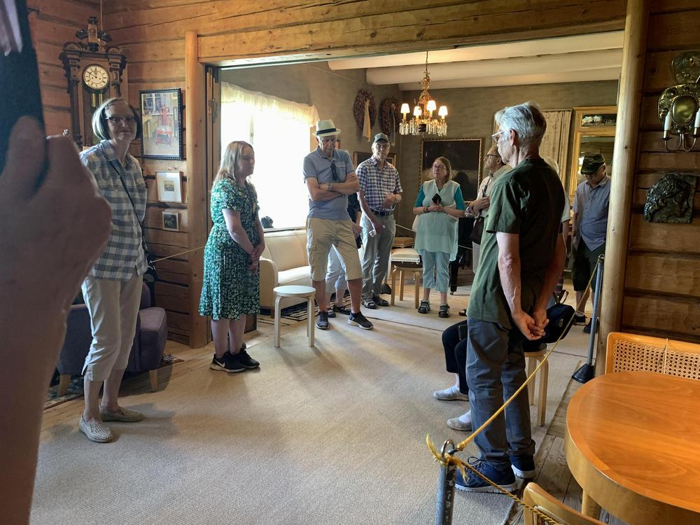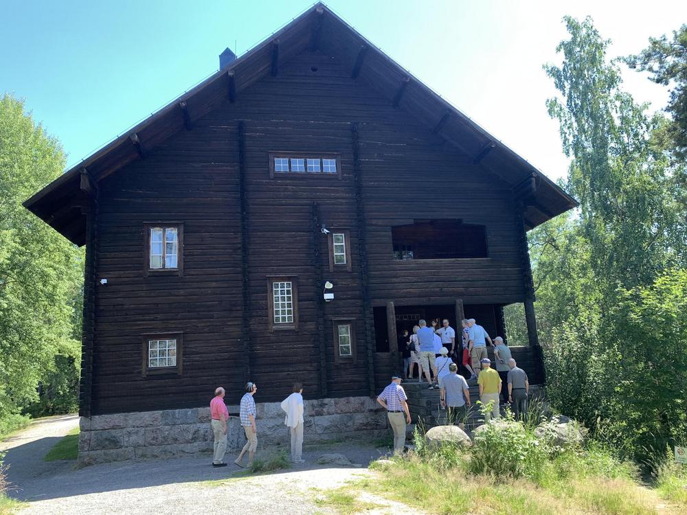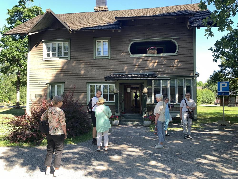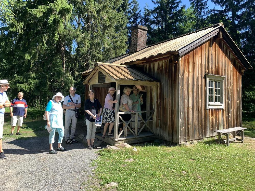 Kokopäiväretkellä aurinkoisessa hellesäässä kävimme suomalaisuuden lähteillä Tuusulanjärven maisemissa. Näimme opastetulla kierroksella Sibeliuksen Ainolan, Halosenniemen, Aleksis Kiven kuolinmökin ja Erkkolan. Outi Ruohela kuvasi ryhmäämme Ainolan sisätiloissa ja Sibeliuksen haudalla sekä Aleksis Kiven kuolinmökin, Halosenniemen ja Erkkolan edustalla.