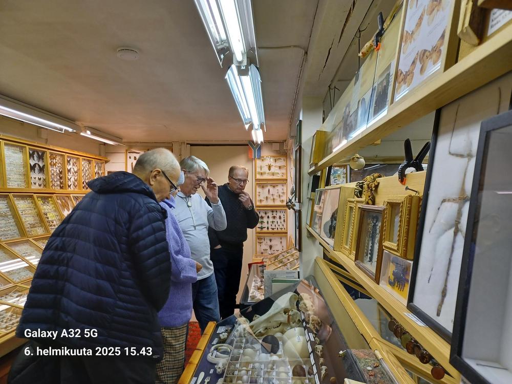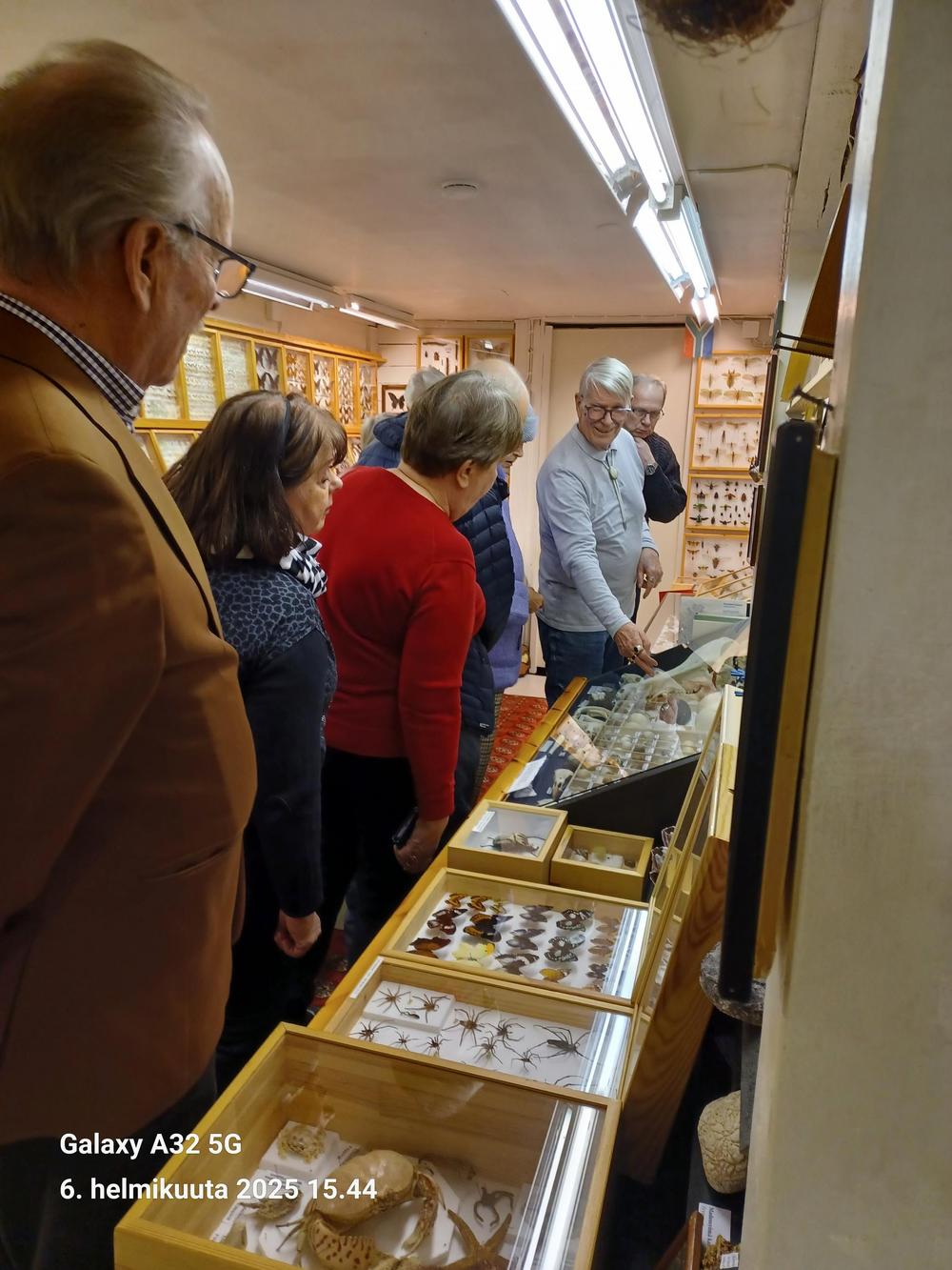 45 senioria tutustui kaupunkiretkellä Stone Galleryn kokoelmiin. Ensin Tuomo Lunnikivi kertoi 68 miljoonaa vuotta vanhan Eremiasaurus-meriliskon viisimetrisen luurangon tarinan - merenpohjasta Marokon atlas-vuoriston syvyyksiin, sieltä luu kerrallaan kaivettuna ja huutokaupattuna monien vaiheiden jälkeen Hämeenlinnaan! Pullakahvien jälkeen siirryimme alakertaan, jossa Pekka Lunnikivi esitteli kivi- ja hyönteiskokoelmaa, joukossa maailman suurimpia perhosia ja pienimpiä käärmeitä.