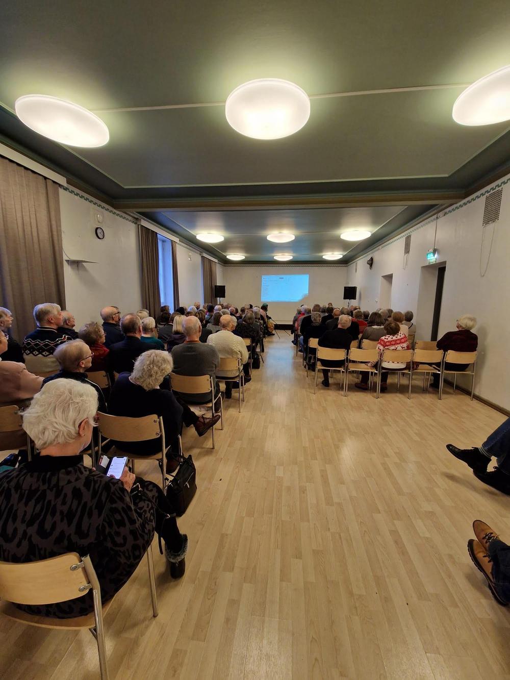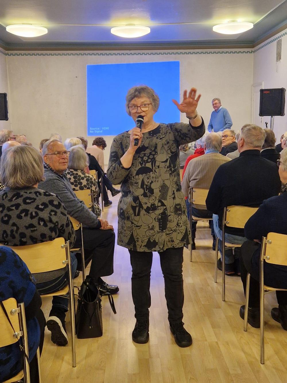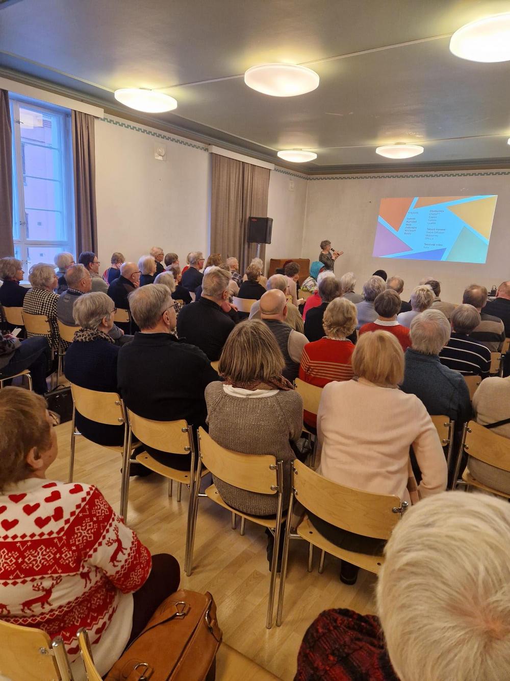 Vuoden ensimmäisessä torstaituokiossa Raija Tuomaala piti värikkään esityksen tekoälystä. Paikalla oli 88 senioria eli lähes täysi tupa. Kuvat: Marja-Terttu Dahl