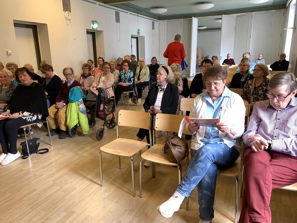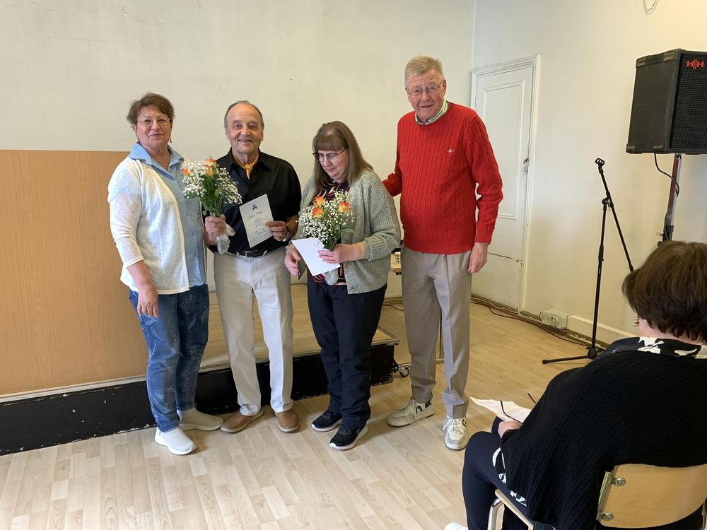 Kevään 2025 viimeisessä torstaituokiossa oli ohjelmassa yhteislaulua, juontajana Juhani Honka ja säestäjänä Seppo Toivanen. Tilaisuuden alussa Juhani sekä Nana Palosaari vastaanottivat Senioriliiton pronssiset ansiomerkit, mukana merkkejä luovuttamassa pj Jaakko Lindén ja vpj Seija Raatikainen. Kuvat: Outi Ruohela