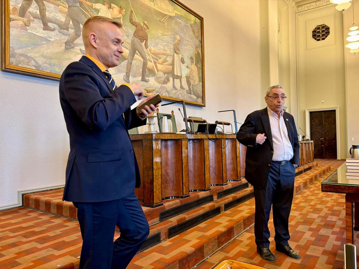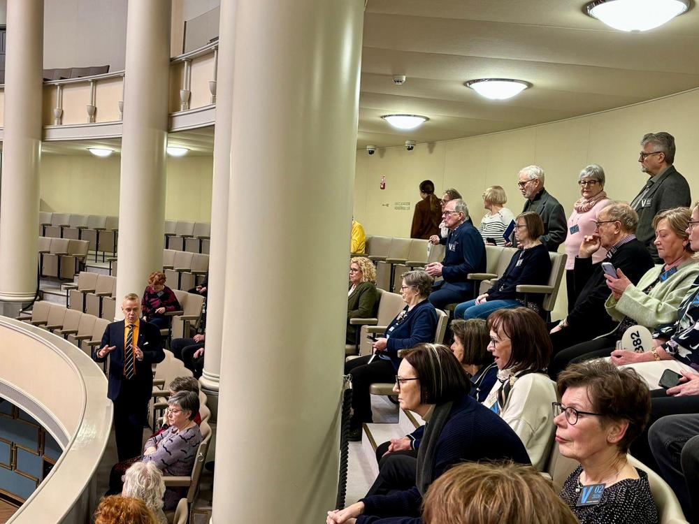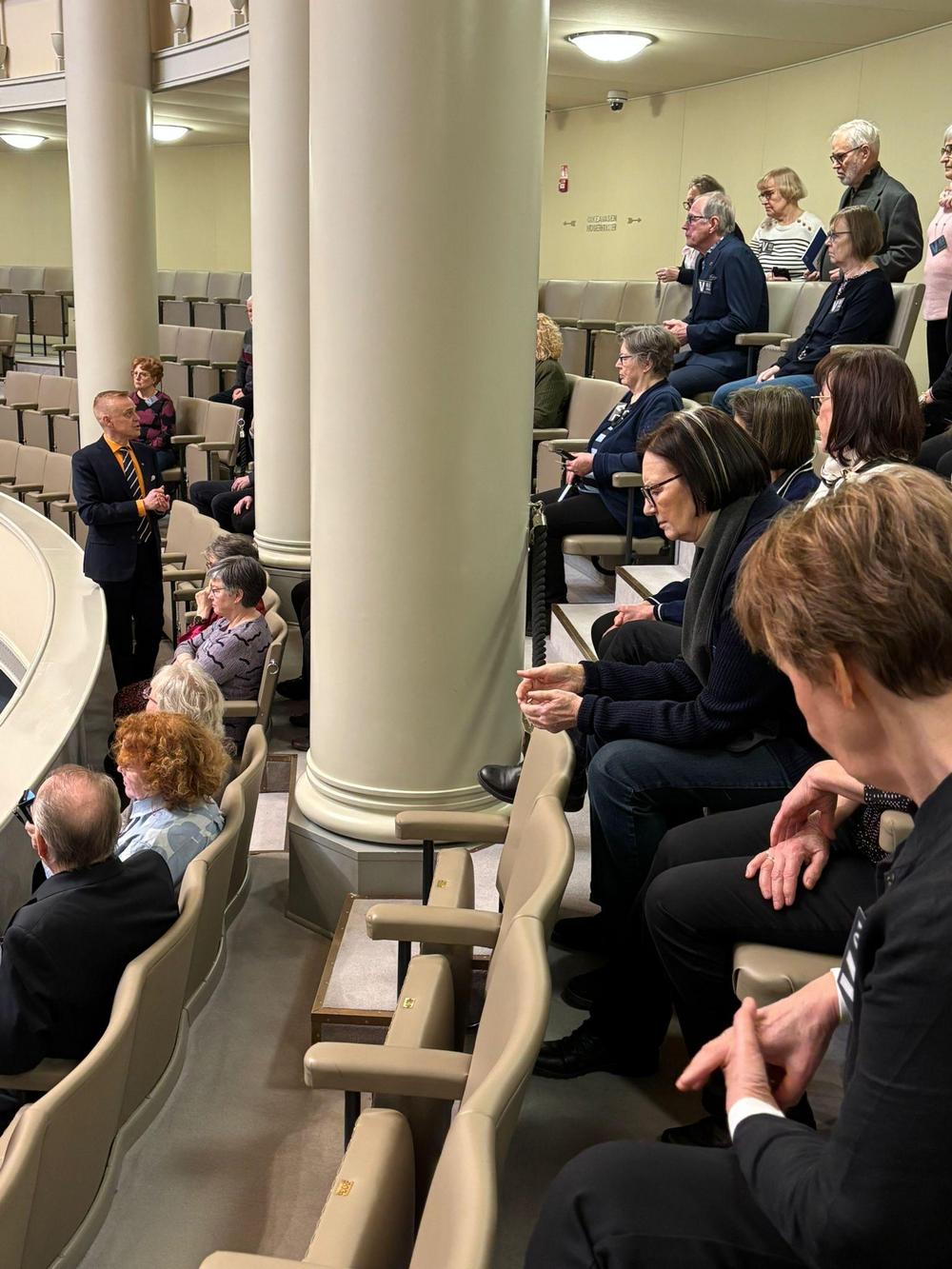 Täysi bussillinen senioreita Helsingissä eduskuntaretkellä. Eduskunnassa isäntänämme tuttuun tapaan kansanedustaja Timo Heinonen, mukana myös veteraanikansanedustaja Ben Zyskowicz. Kävimme myös Finlandiatalossa katsomassa Aalto-näyttelyn ja nauttimassa Finlandialeivokset. Kuvat: Marja-Riitta Lindén.