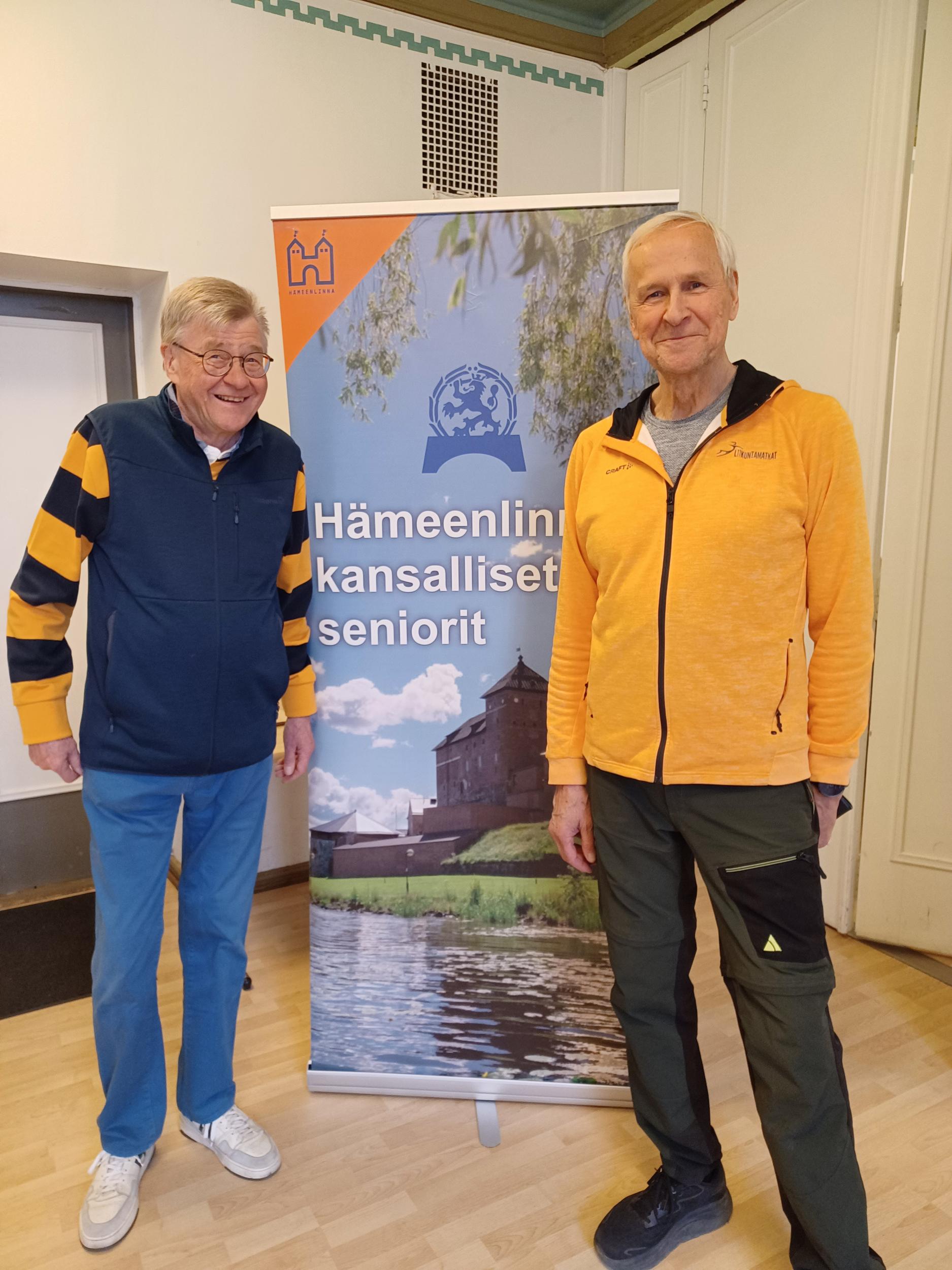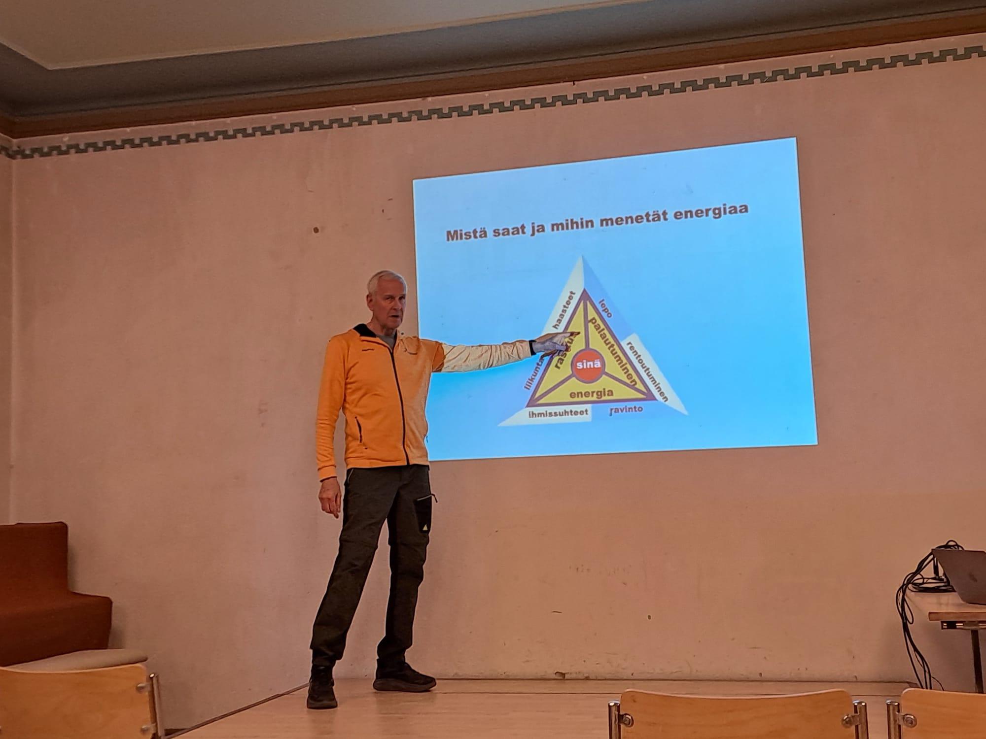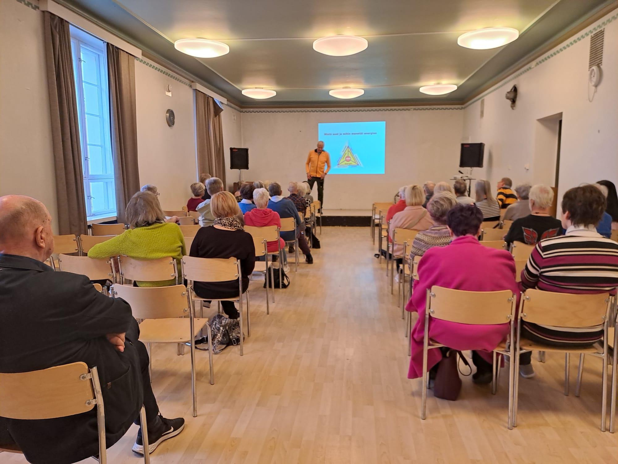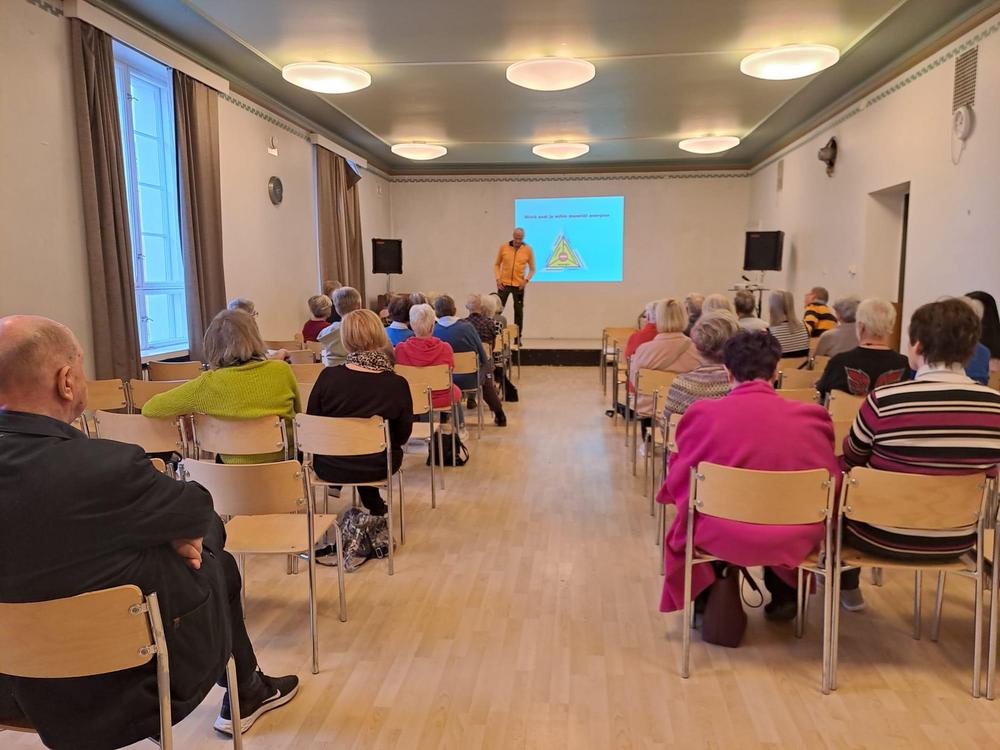 16.4 Torstaituokiossa ex-ammattilaislentopalloilija Jouni Parkkalin esitys: Kotikonstein keho kuntoon. Pitkät miehet, Jouni ja puheenjohtajamme Jaakko yhdistyksemme roll-upin luona, kuva: Jorma Railio. Jounin ja yleisöä kuvasi Leena Railio.